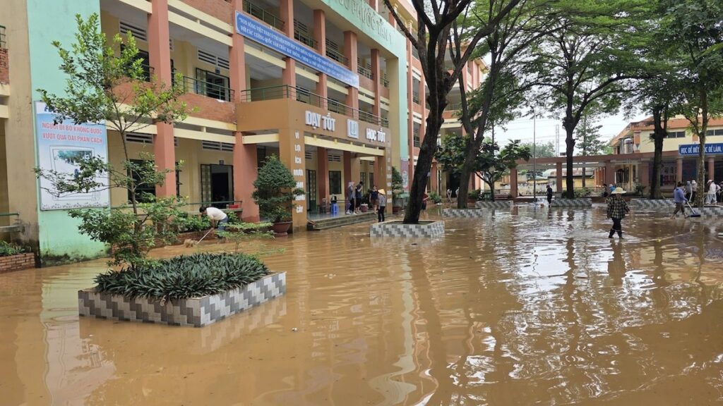 Đến sáng nay, trời hửng nắng, nước bắt đầu rút. Nhà trường huy động giáo viên đến dọn dẹp, bơm nước ra ngoài. Tuy nhiên, để đảm bảo an toàn cho học sinh, trường báo cho các em nghỉ, đi học trở lại vào sáng thứ 2 tuần sau (15/9).