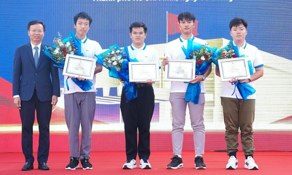 Bốn thí sinh dẫn đầu trong số gần 6.000 tân sinh viên được trường Đại học Bách khoa, Đại học Quốc gia TP HCM, tặng bằng khen và 25 triệu đồng từ nhà tài trợ, tại lễ khai giảng ngày 5/9.