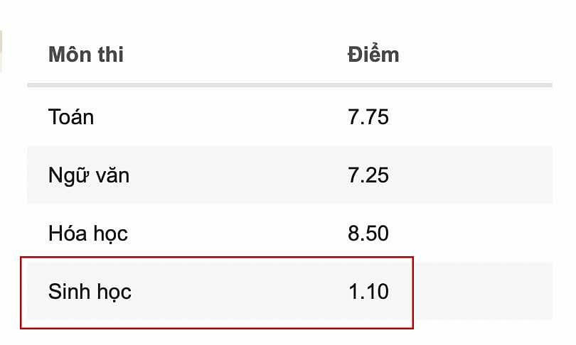 Điểm ban đầu của thí sinh ở Lào Cai với môn Sinh học đạt 1,1 điểm.
