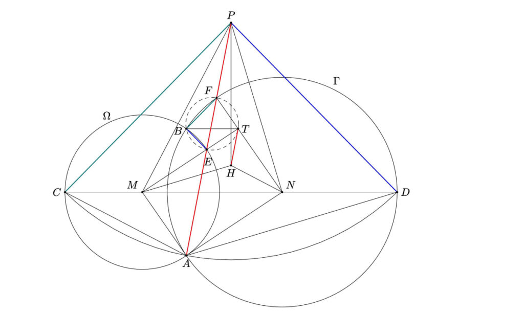 “Cho các đường tròn Ω và Γ có tâm tương ứng là M và N sao cho bán kính của Ω nhỏ hơn bán kính của Γ. Giả sử các đường tròn Ω và Γ cắt nhau tại các điểm phân biệt A và B. Đường thẳng MN cắt Ω tại điểm C và cắt Γ tại điểm D, sao cho thứ tự các điểm trên đường thẳng đó lần lượt là C, M, N và D. Gọi P là tâm đường tròn ngoại tiếp tam giác ACD. Đường thẳng AP cắt lại Ω tại điểm E ≠ A. Đường thẳng AP cắt lại Γ tại điểm F ≠ A. Gọi H là trực tâm của tam giác PMN.