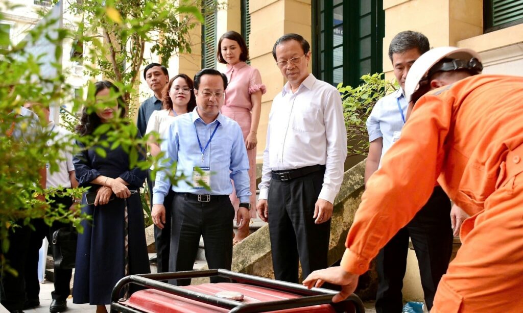 Thứ trưởng Bộ Giáo dục và Đào tạo Phạm Ngọc Thưởng (áo trắng, đeo kính) kiểm tra công tác chuẩn bị của Hà Nội hôm 20/6. Ảnh: MOET