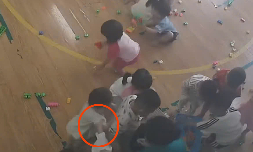 Cô giáo lôi tay con chị Thương (khoanh đỏ) vào góc khuất, sau đó đánh. Ảnh chụp màn hình
