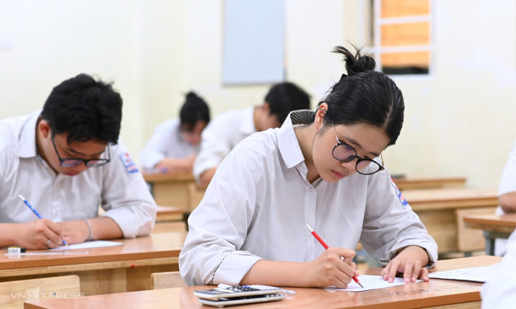 Thí sinh làm bài thi tốt nghiệp tại trường THPT Nguyễn Trường Tộ, quận Đống Đa, Hà Nội, sáng 27/6. Ảnh: Giang Huy