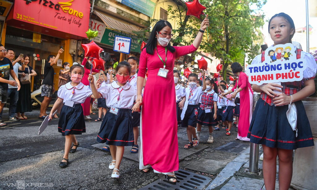 Học sinh lớp 1 trường Tiểu học Thăng Long, quận Ba Đình, Hà Nội, tựu trường, tháng 8/2022. Ảnh: Giang Huy