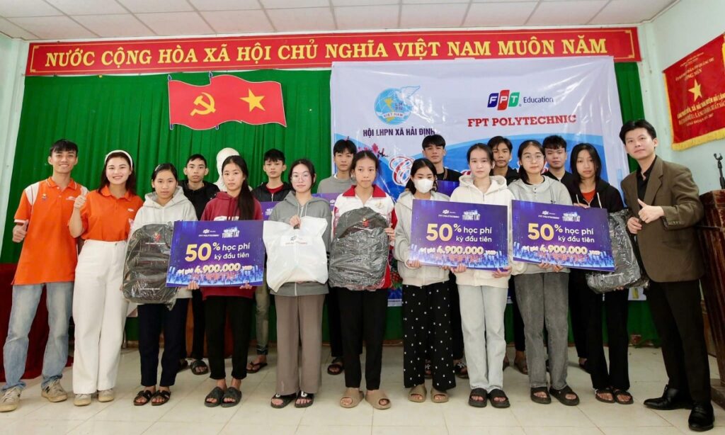 FPT Polytechnic Đà Nẵng trao học bổng hỗ trợ 50% học phí kỳ đầu “Thắp sáng tương lai” cho học sinh có hoàn cảnh khó khăn tại xã Hải Định, Quảng Trị. Ảnh: FPT Polytechnic