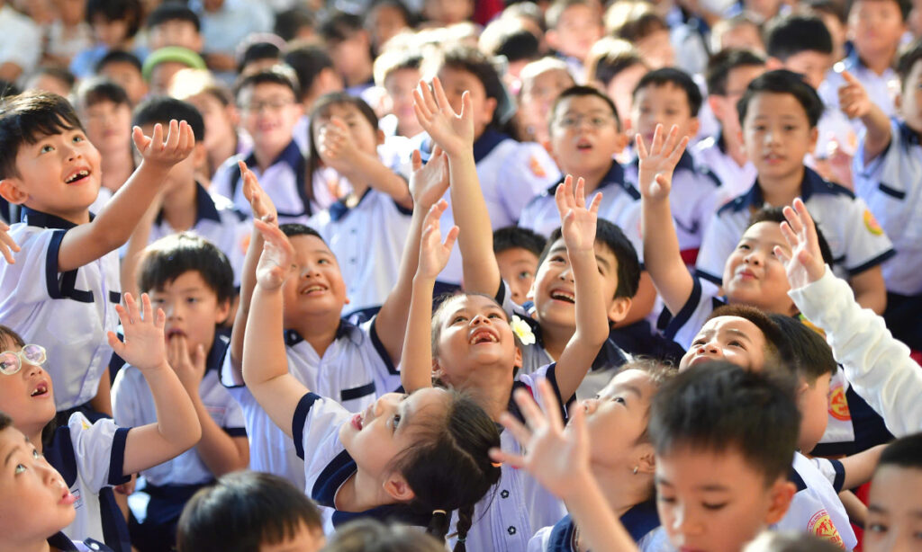 Học sinh trường tiểu học Nguyễn Bỉnh Khiêm, phường Sài Gòn nô đùa trước giờ làm lễ khai giảng ở sân trường. Ảnh: Thanh Tùng