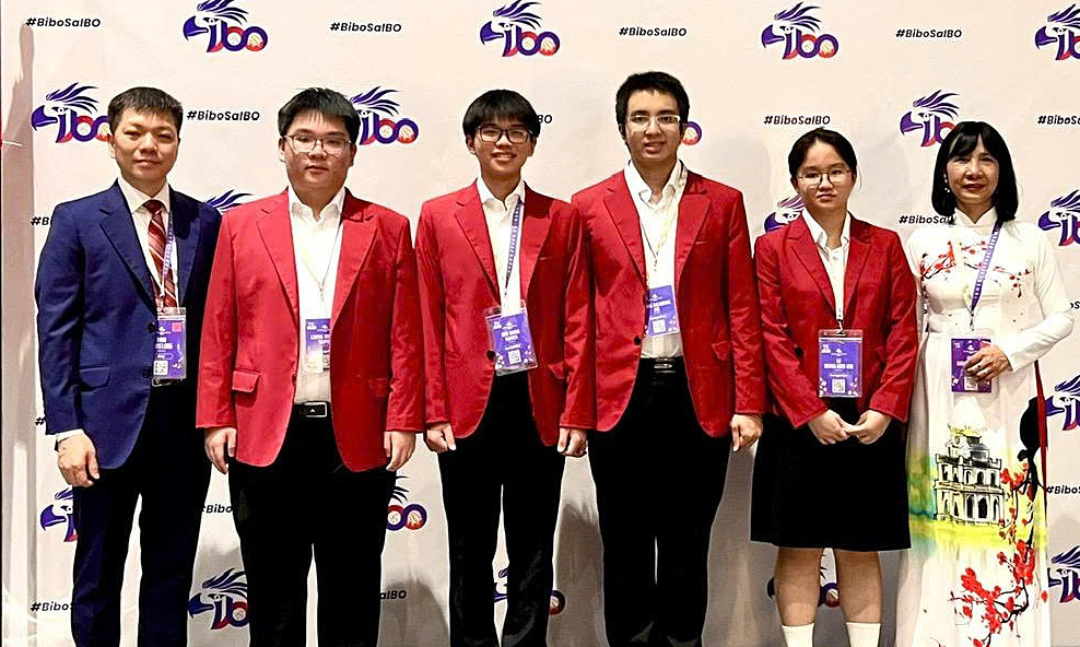 Đội tuyển IBO 2025 (từ trái sang): PGS.TS. Đinh Đoàn Long (trưởng đoàn); các học sinh Nguyễn Lương Thái Duy, Nguyễn Hữu Thành, Bùi Hoàng Đại Dương, Lê Hoàng Kiều Anh; PGS.TS Lê Thị Phương Hoa, Phó Trưởng đoàn. Ảnh: MOET