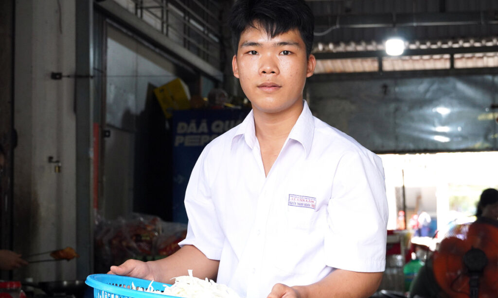 Nghĩa trong giờ làm thêm ở căng tin trường. Ảnh: Chúc Ly