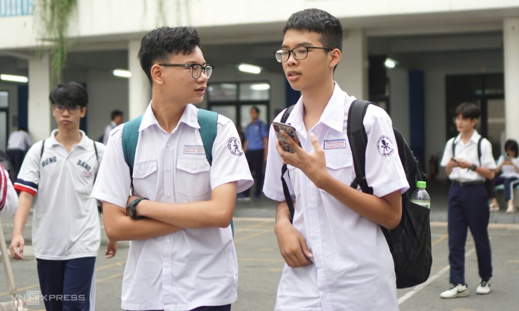 Học sinh sử dụng điện thoại để liên hệ phụ huynh sau giờ thi vào lớp 10 trường Phổ thông Năng khiếu, tháng 5. Ảnh: Lệ Nguyễn