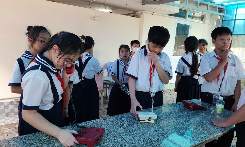Học sinh THCS Lê Văn Tám, TP HCM, dùng điện thoại của trường để liên hệ với bố mẹ. Ảnh: Sơn Ca
