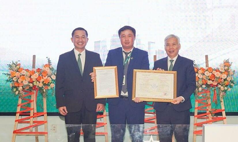 TS. Nguyễn Mai Lâm – Quyền hiệu trưởng trường Đại học Tân Tạo (giữa) nhận giấy chứng nhận kiểm định chất lượng cơ sở giáo dục. Ảnh: Trường Đại học Tân Tạo